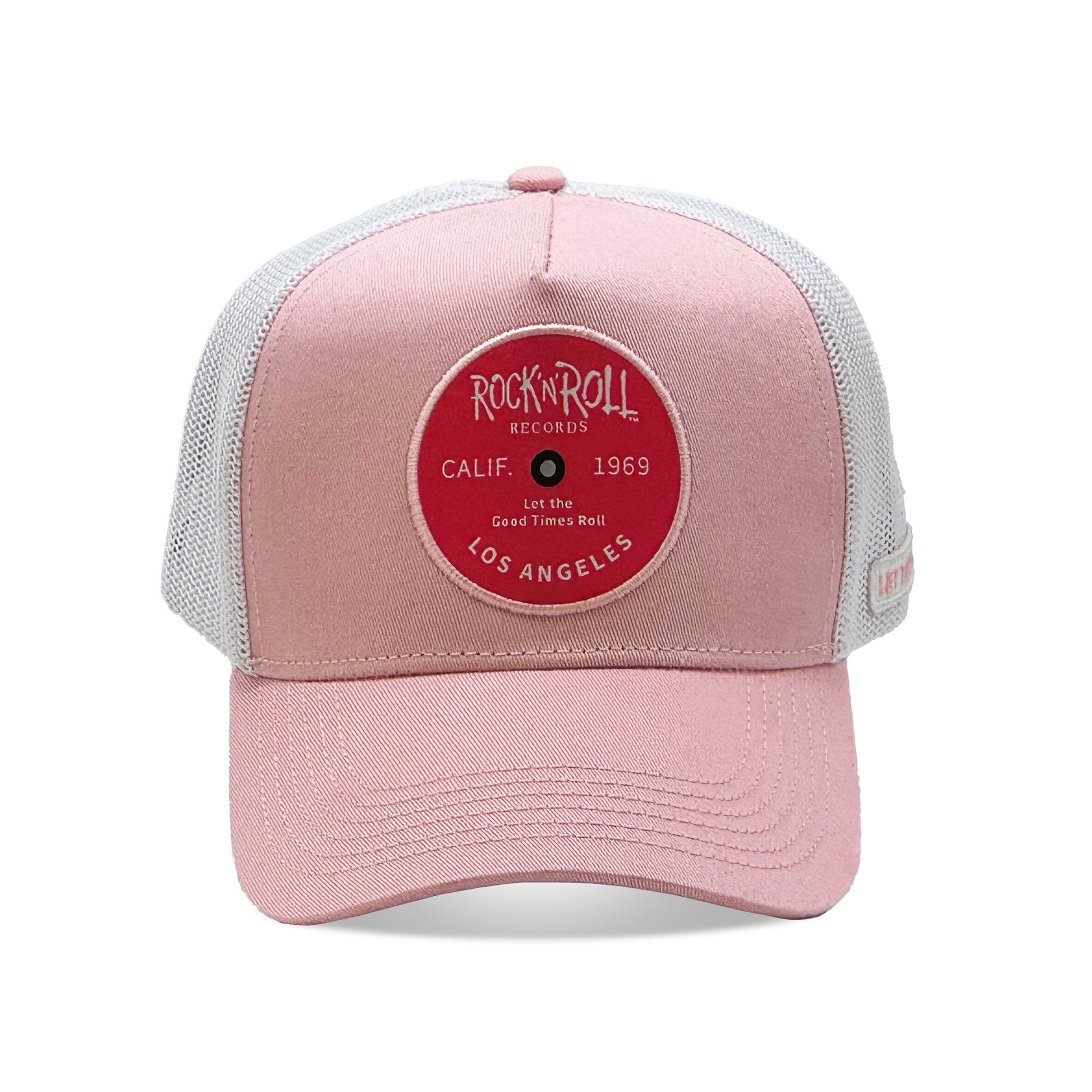 Iconic Rock N Roll Records Snapback Trucker Hat in solid Pink, cotton twill with white and black accents. Features the classic record logo embroidered patch on front, "Let the Good Times Roll" embroidered patch on side, white breathable mesh rear with an adjustable snapback panel.